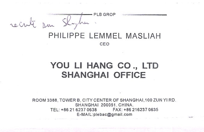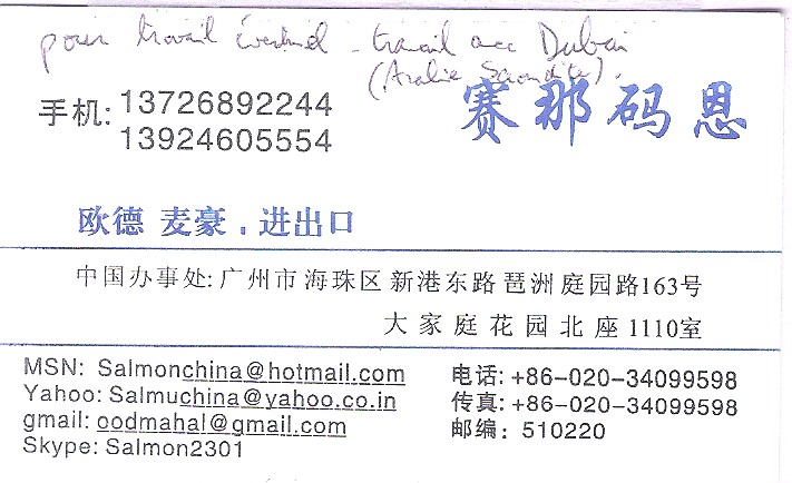 - Un arabe est passé. Un vrai, venant d'Arabie Saoudite ou environs, avec et mon CV pourrait bien intéresser une personne sur Dubai (Dubai à l'air vraiment bien soit dit en passant, j'ai vu leur pub sur la Chaine de télé Al jazeera - une très bonne chaine en anglais que je vous recommande par ailleurs -) ... Ci-dessous, évidemment, sa carte business est en chinois...