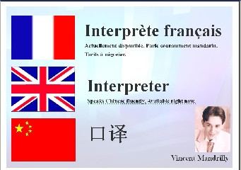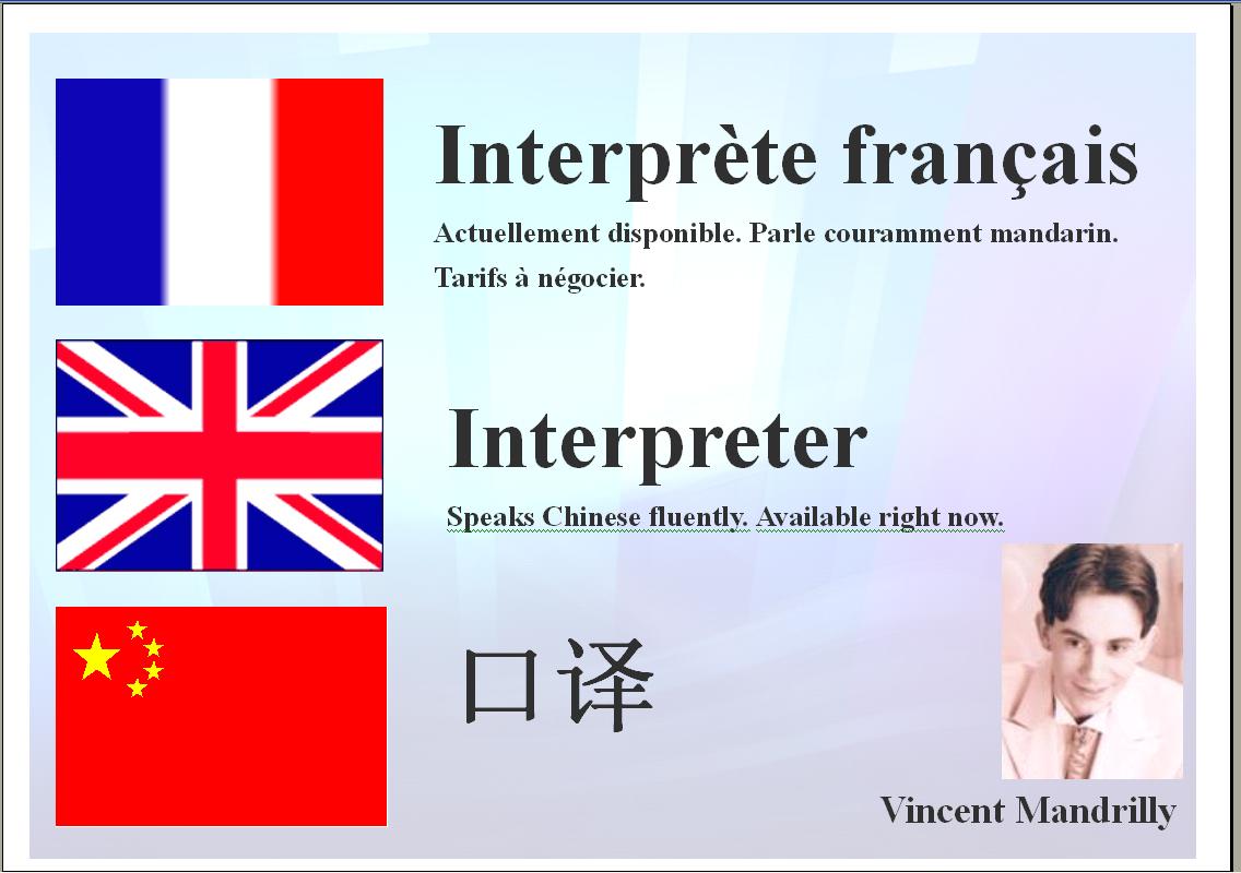 Tandis que Bin part à son boulot, je bricole rapidement un carton en vue de me faire de la pub pour trouver des clients qui auraient à tout hasard besoin d'un interprète.