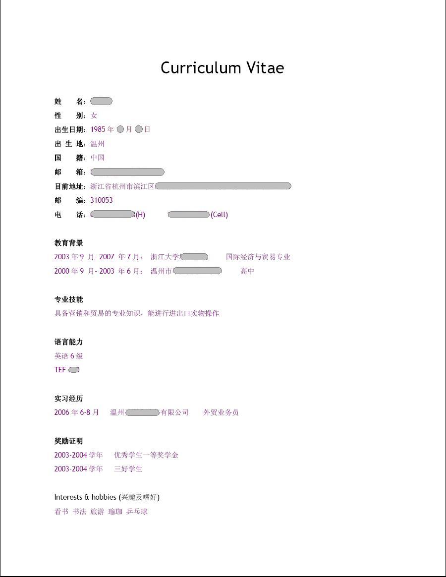 Pour ma part, il s'agit des domaines de l'éducation (spécialités des étudiants, CV, lettres de motivations, etc), des documents de demande de visa (Hukou, certificats de travail, de naissance, de marriage, etc), du domaine du graphisme (spécialité de ma femme) et du textile (étant par ailleurs agent pour la production de vêtements en Chine ).